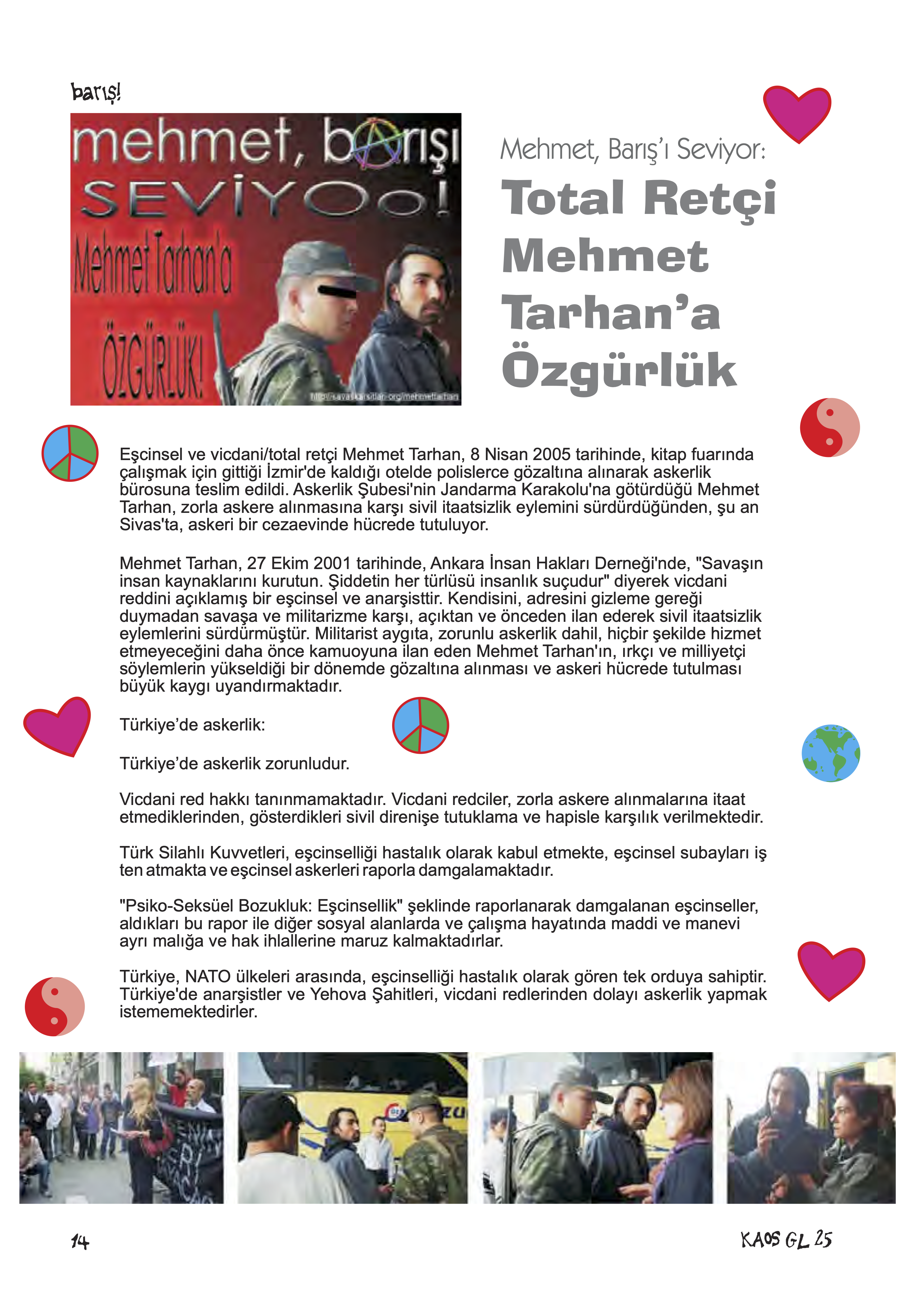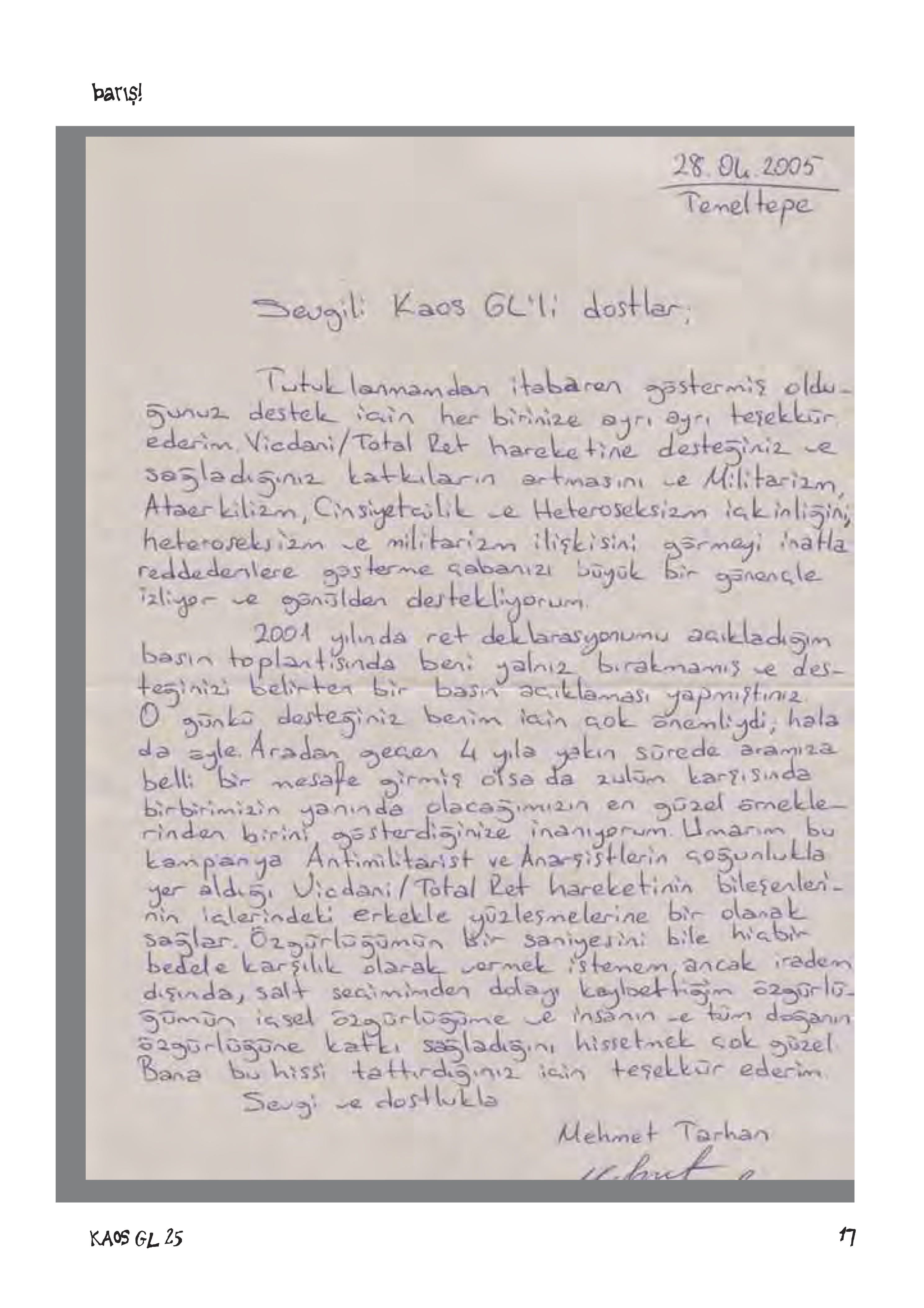 [15] Kaos GL (2005). Mehmet, Barış’ı Seviyor: Total Retçi Mehmet Tarhan’a Özgürlük, Kaos GL Dergisi, 87, 14-15.