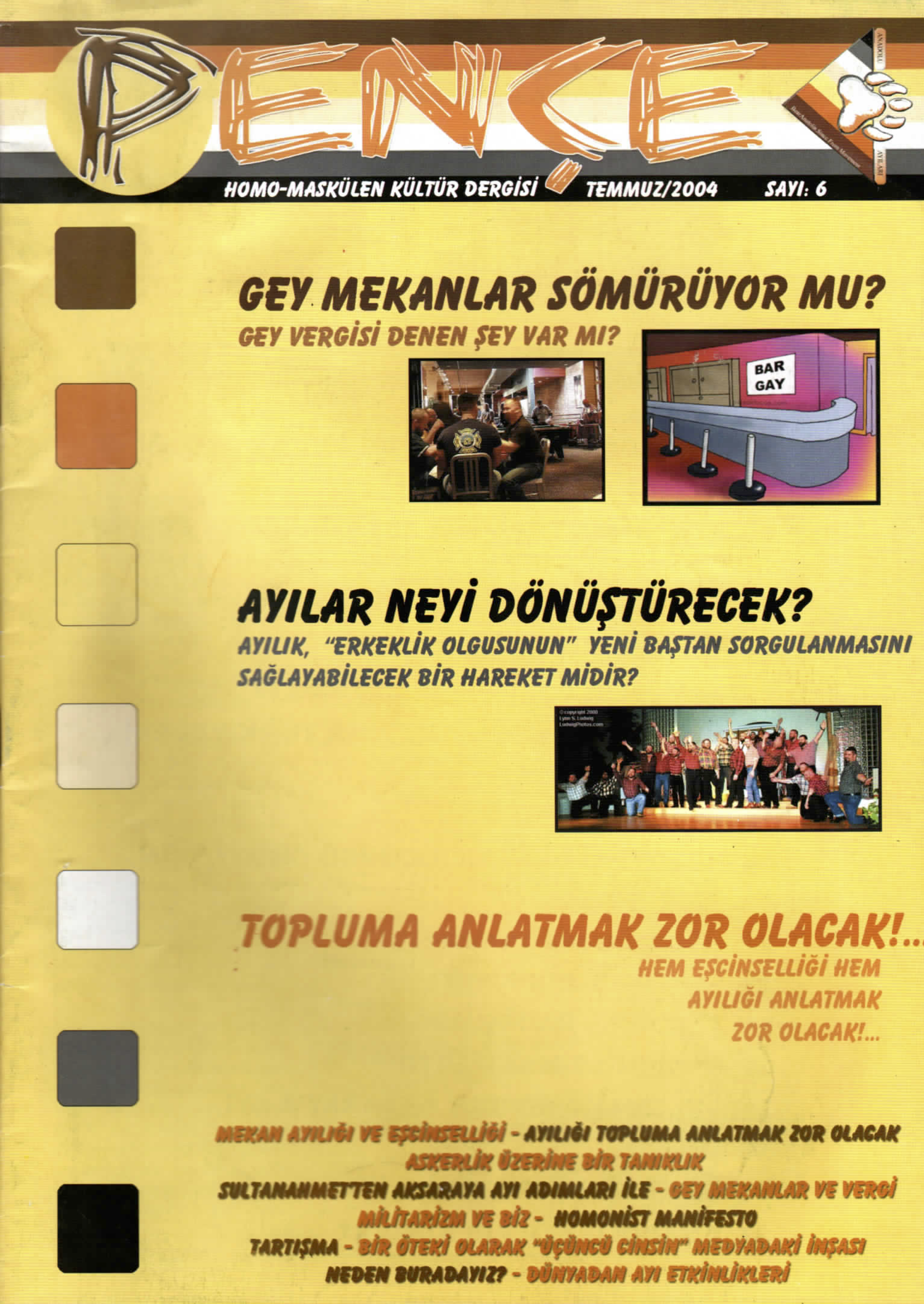 Askerlikle ilgili bir diğer önemli kaynak ise “homo-maskülen kültür dergisi” Pençe’nin Temmuz 2004 sayısı. Ayı hareketinin kısa süreli yayınlarından Pençe’nin altıncı sayısında askerlik üzerine bir tanıklığın yanı sıra militarizm üzerine bir yazı da yer alıyor[11]: